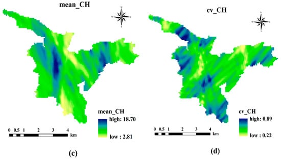 Spatial interpolation results of ICESat-2 light-spot vertical structure variation characteristics in 4 study areas: (a) Standard deviation of percentile canopy height, (b) variance of percentile canopy height, (c) mean percentile canopy height, and (d) coefficient of variation of (a) standard deviation of percentile canopy height, (b) variance of percentile canopy height, (c) mean percentile canopy height, and (d) coefficient of variation of percentile canopy height.