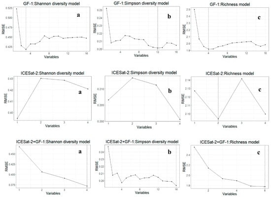 For the synergistic features combining the above spectral variance features and structural variance features, the final number of features involved in tree species Shannon, Simpson, and richness index modeling was 4, 16, and 6, respectively. That is, the RMSE corresponding to the Shannon–Wiener, Simpson, and richness index models can be reduced to the minimum value when one, four, and two vertical variation features are taken, respectively.