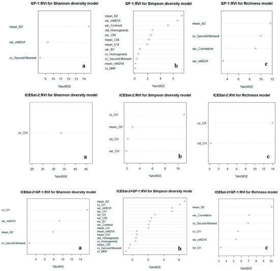 Ranking of feature importance for tree species diversity models based on different remote sensing data. (a) Feature importance ranking for the Shannon diversity model; (b) Feature importance ranking for the Simpson diversity model; (c) Feature importance ranking for the richness model.