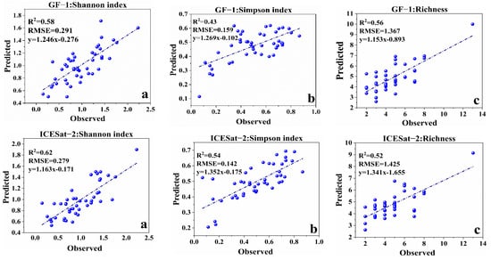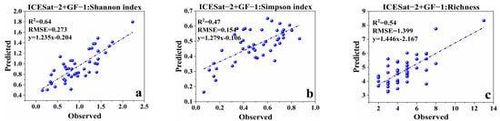 Scatter plots of estimated versus observed tree diversity indices were obtained using the horizontal spectral variance (GF-1/PMS), the vertical structural variance (ICESat-2/ATLAS), and the synergistic feature combining the horizontal spectral variance with the vertical structural variance (ICESat-2 + GF-1) modeled under leave-one-out cross-validation. (a) Performance of the Shannon diversity model; (b) Performance of the Simpson diversity model; (c) Performance of the richness model.