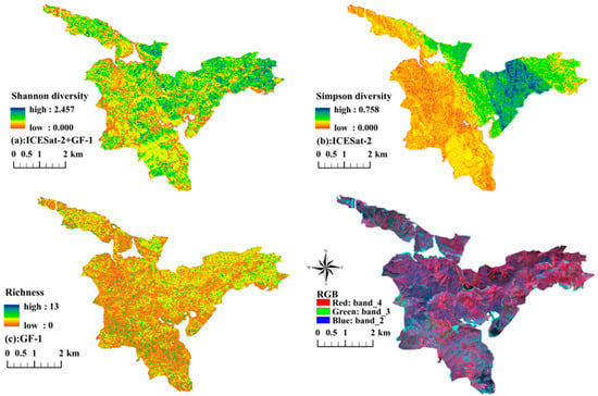 For a long time, remote sensing modeling of tree species diversity has been based on the principle of spectral heterogeneity [], which explains tree species diversity only from the spatial variability of spectral features in the forest canopy. However, such studies have not considered the relationship between the complexity of the vertical structure of the community and tree species diversity and then used remote sensing to quantify the variation features of the vertical structure of the forest to reflect tree species diversity from the dimension of vertical structure variability. This problem is particularly prominent in satellite remote sensing applications [,,]. Spectral variation information can explain the diversity of forest tree species through the spatial heterogeneity of spectral features in the vegetation canopy on a large scale. Spectral variation information is an indispensable source of information for the remote sensing modeling of vegetation diversity due to its high availability, support for continuous observation on a large scale, and wealth of information []. However, spectral variability information at the canopy level can only reflect species variability in the horizontal orientation, not the vertical, and is susceptible to a light saturation effect. Vertical structure variation information can indirectly reflect tree species diversity through canopy height variability in the vertical direction, which is a useful complement to spectral variability information, but it cannot explain canopy-level tree species variation [,]. Therefore, how to integrate the horizontal spectral variation and vertical structural variation based on satellite remote sensing data to objectively represent tree species diversity is the focus of current forest vegetation diversity modeling research, which is one of the important objectives of this study.