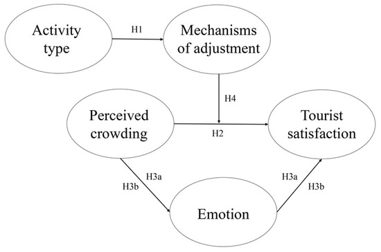 Urban forest parks enable tourists to engage in a rich variety of activities, including social activities, cultural activities, and sports. Adjustment behaviors reflect the need of people to manage their intrinsic stress through behavioral or cognitive efforts [24]. This concept was first applied by sociologists in studies related to entertainment and was introduced into tourism research in the late 1970s [25]. In the context of tourism, mechanisms of adjustment are behavioral and are ultimately identity mechanisms that people generate so as to have better recreational experiences. These adjustments continue until a tourist no longer feels stressed. To date, there is no unified standard for the classification of mechanisms of adjustment. Generally, adjustment behaviors can be divided into five categories [26,27,28]: cognitive adjustment (where tourists reduce psychological stress by adjusting their expectations), spatial adjustment (tourists choose to shift their areas of activity), activity adjustment (tourists change their activity types), temporal adjustment (tourists choose to avoid peak periods and choose other times to travel), and no adjustment (tourists leave the destination or perceive no obvious crowding). The choice of adjustment behavior is influenced by a variety of factors but perhaps most prominently by the type of activity [21,29]. Tourists engaging in different types of activities have different tourism behaviors; hence, their perceptions of crowding and choices of adjustment behaviors might be different [30]. Therefore, we propose the following hypothesis: