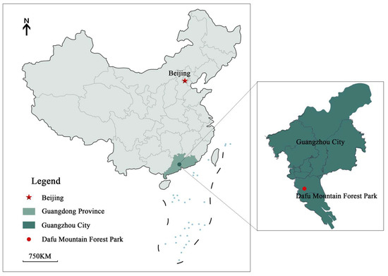 We selected Dafu Mountain Forest Park, located in Guangzhou, China, as a representative case study (Figure 2). Located in southeastern China, Guangzhou is the core city of the Guangdong–Hong Kong–Macao Greater Bay Area and one of the four largest cities in China, with a population of 18.8 million as of 2021. The park is located in the southern part of Guangzhou, in the center of the Guangzhou–Foshan metropolitan area, and covers a total area of 546.6 hm2, including 442.8 hm2 of woodland. Thus, this park has the characteristics of both a forest park and an urban park. Dafu Mountain Forest Park attracts many tourists because of its pleasant natural conditions and abundance of available activities. Data show that before COVID-19, the number of tourists visiting the park was 4.6 million in 2019, and even in May 2020, the number of tourists was approximately 100,000, with approximately 180,000 on National Day. The enthusiasm of tourists is higher during the holidays, and this leads to overcrowding. This park is a major tourist destination not only for the area’s residents but also for people across China.
