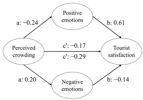 In the questionnaire, we characterized emotions as either positive or negative and constructed mediating effect models for the role of positive and negative emotions in the perception of overcrowding and its effect on tourist satisfaction, which we found to have a good fit with the data (Table 7). The mediating effect of emotion was tested using AMOS 26.0 (Figure 4). According to Liu (2021) [29], “c” represents the path coefficient of the total effect of perceived crowding on tourist satisfaction, “ab” represents the path coefficient of the mediating effect, and “c′” represents the direct effect. The relationship between these effects is defined as “c = c′ + ab”, and the magnitude of the mediating effect is determined by “c − c′ = ab” (Table 8). The results showed that both positive and negative emotions were significant at the 95% probability level, and both direct and indirect effects were significant. The mediating effect of positive emotions accounted for 46.9% of the total effect, but the mediating effect of negative emotions accounted for only 9.4% of the total effect. This indicated that both positive and negative emotions played a partial mediating role between perceived crowding and tourist satisfaction. Perceived crowding influenced satisfaction mainly through positive emotions, and tourists could experience higher satisfaction under the influence of positive emotions. Therefore, neither H3a nor H3b were rejected.