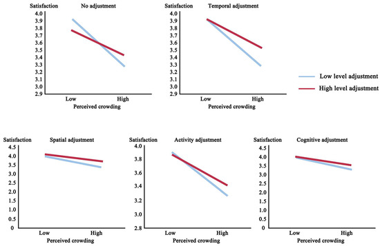 The results showed that perceived crowding had a significant negative effect on tourist satisfaction and that the mechanisms of adjustment could weaken this effect (Table 9). In the case of no adjustment, the R2 of the first model was 0.182, and the R2 of the second model was 0.209. When the interaction was added to model 1 (becoming model 2), the R2 changed to 0.027, though the results became statistically significant (p < 0.05, F change of 0.000). In the case of temporal adjustment, the R2 of the first model was 0.208, and the R2 of the second model was 0.227, which changed to 0.019 when the interaction was added to model 1 and showed a significant change (p < 0.05, F change of 0.001). In the case of spatial adjustment, the R2 of the first model was 0.253, and the R2 of the second model was 0.265, which changed to 0.012 when the interaction was added, although, again, the results were statistically significant (p < 0.05, F change of 0.007). In the case of activity adjustment, the R2 of the first model was 0.188 and the R2 of the second model was 0.240, which changed to 0.052 after the interaction term (p < 0.05, F change of 0.000). Finally, in the model of cognitive adjustment, the R2 of the first model was 0.227 and the R2 of the second was 0.235, which changed to 0.007 after the interaction term was added (p < 0.05, F change of 0.038) (Figure 5).