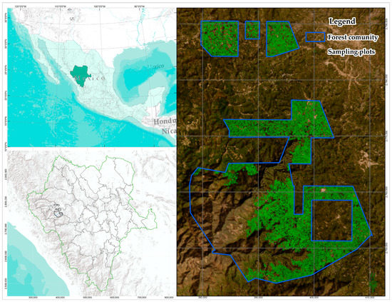 This study was developed in a forest community in Northern Mexico, specifically in the state of Durango. The forest community is called San Diego de Tezains (24°48.2′ to 25°19.5′ N and −105°52.2′ to −106°12.9′ W), and the total area is around 61,098 ha, of which 30,000 ha are used for forest management and timber harvesting. The main applied silvicultural treatments are based on continuous cover forestry (CCF) and rotation forest management (RFM) [30]. The silvicultural treatments for the CCF areas are based on selection, while RFM entails tree thinning and shelterwood cutting treatments with 15 years of forest cycle cutting [31]. The location of the study area is showed in Figure 1. The mean annual temperature ranges from 5 to 18 °C and the lowest temperature occurs in January (−6 °C) and the hottest in May (28 °C). The altitude varies from 1500 to 3033 m. The mixed-species stands are represented by seven genera: Pinus, Quercus, Juniperus, Cupressus, Pseudotsuga, Arbutus, and Alnus. The main species are Pinus durangensis Martínez and Quercus sideroxyla Bonpl. Lately, the improved forest management combines forest management and carbon credit offsets according to the Mexican Protocol developed by the Climate Action Reserve [32].
