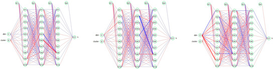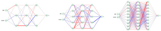 Plots of RBPANN-tanh (left), RBPANN-softplus (center), and RBPANN-logistic (right) for h-dbh relationship with unsupervised clustering analysis. Bias is included in nodes “B”. Positive weight values in the visual representation are denoted by blue lines, while negative weight values are represented by red lines.