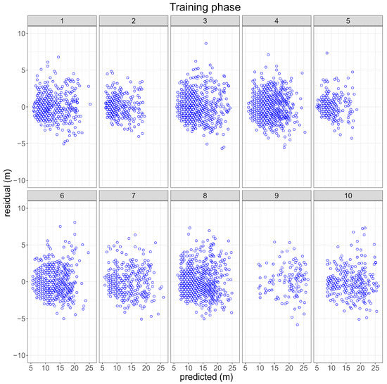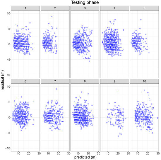 The residual and predicted values are presented in Figure 5 for each cluster-group by the RBPANN-tanh, which was the best approach in the training phase to model the h-dbh relationship. In general, the residuals ranged between −6 m and 6 m. Enhancing the training phase could involve increasing the number of repetitions or epochs; however, the computational process would be significantly time consuming. In the context of the analysis, cluster-groups 6 and 10 demonstrated notable variations or spread in the residual values. When there is a considerable dispersion in the residuals, it suggests that the ANN predictions differ widely from the actual data points within these specific cluster-groups. Despite the significant accuracy of predictions during the training phase for the RBPANN-tanh activation function, it is essential to carefully assess its performance during the testing and validation stages to ensure its robustness and generalizability.