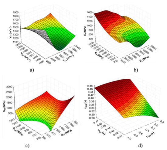 Resonance spruce. Multiple correlations among the velocities of longitudinal waves, the moduli E and G and the Poisson ratios []. (a) The velocities VLL, VRR and VTT. (b) The Young’s moduli. (c) The shear moduli. (d) The Poisson ratios (r = 0.962 p < 0.001, see the red color). Lower coefficients are represented in green.