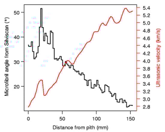 Variation of microfibril angle, ultrasonic velocity versus the distance from the pith of a Pinus radiata disk (Figure 5, page 4 []).
