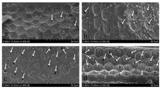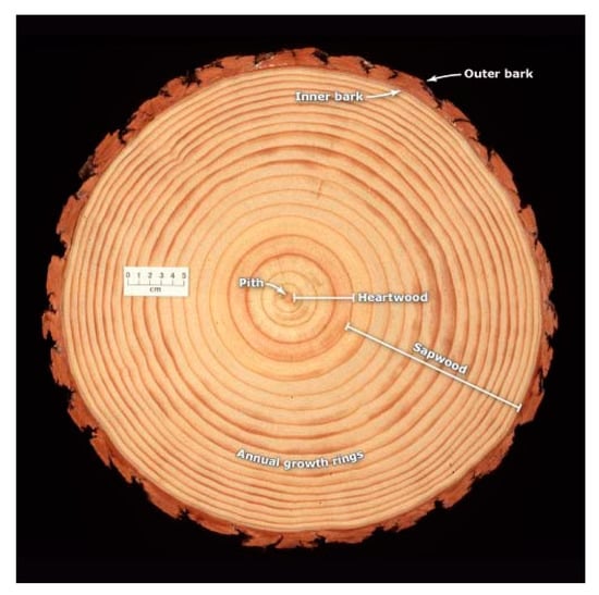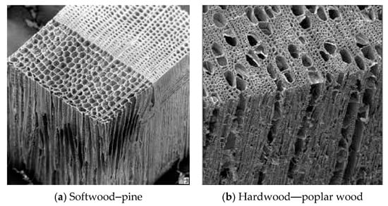 Fine structure of wood. Legend: (a) https://www.vcbio.science.ru.nl/public/Final-Images/PL_Final685z_201-250/PL0223_685zPinusWoodSEMTangentialRadialTransverse.jpg; (b) https://www.researchgate.net/profile/Ralf_Moeller/publication/40097978/figure/fig4/AS:669383294734347@1536604822282/Scanning-electron-microscopy-image-of-poplar-wood-In-the-upper-half-the-vessels-and.png (accessed on 5 May 2021).