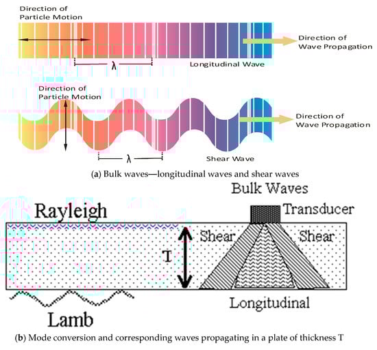 Types of waves propagating in solids. (a) Longitudinal waves and shear waves https://static4.olympus-ims.com/data/Image/fd-tutorial/wave_propagation_modes1.jpg?rev=AE2D (accessed on 5 May 2021). (b) Surface waves—Rayleigh waves and Lamb waves generated by mode conversion https://www.ndt.net/article/wcndt00/papers/idn358/fig2.gif (accessed on 5 May 2021).