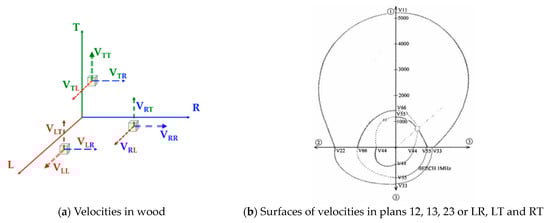 Velocities of propagation of ultrasonic waves in wood and the corresponding surfaces of velocities in three anisotropic planes. Principal axes of wood L, R and T. Legend: longitudinal wave velocities VLL, VRR and VTT; shear wave velocities VLR and VRL, VLT and VTL, VRT and VTR [].