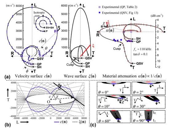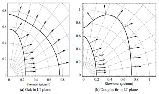 It is worth mentioning that propagation out of principal directions of elastic symmetry for an orthotropic solid generates three types of waves: QL, QR and T. The energy of these waves is different. The normal wave can generate phenomena of conical refraction of waves. Ultrasonic energy propagation through wood was studied by [,,,]. In wood, as in other anisotropic materials, the group velocity vector generally differs from the phase velocity vector. The group velocity vector is normal to the slowness surface of a wave mode.