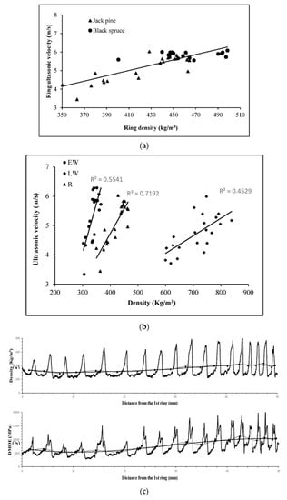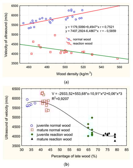 Another interesting aspect related to the quality of resonance wood is the low microfibril angle of about 5° []. This structural element contributes to the waves’ propagation in the L direction. The variation of ultrasonic velocity with microfibril angle was studied on a disk of Pinus radiata from the pith to the bark (Figure 2). In Pinus radiate, the value of the microfibril angle is between 5° and 35° and the ultrasonic velocity VLL is between 2800 m/s and 5400 m/s.