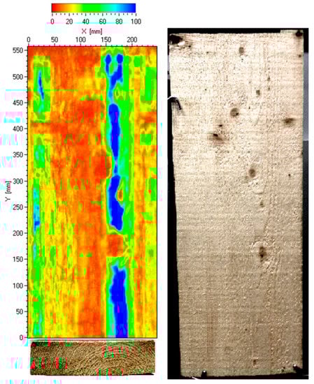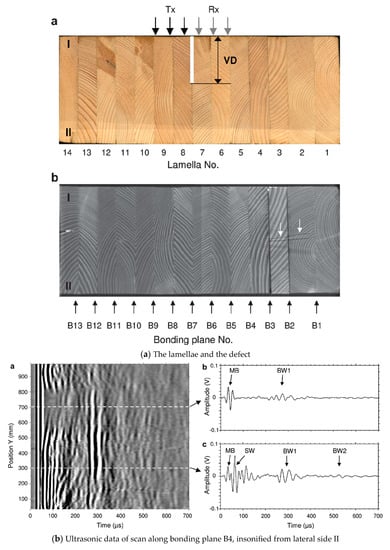 - Neuenschwander, J.; Sanabria, S.J.; Schuetz, P.; Widmann, R.; Vogel, M. Delamination detection in a 90-year-old glulam block with scanning dry point-contact ultrasound. Holzforschung 2013, 67, 949–957. [Google Scholar] [CrossRef][Green Version]