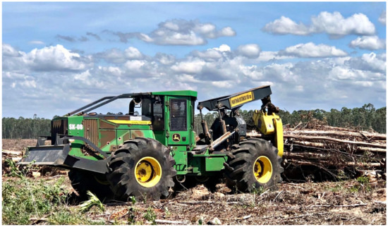 - Barros, A.P.d.S.; de Freitas, L.C.; Leite, E.d.S.; Luz, D.S.; da Silva, L.F.; Sena, B.S.; Santos, J.C. Influência Do Volume Por Árvore e Da Distância de Extração No Desempenho Do Skidder Em Povoamentos de Eucalipto. Sci. For. 2021, 49, e3612. [Google Scholar] [CrossRef]