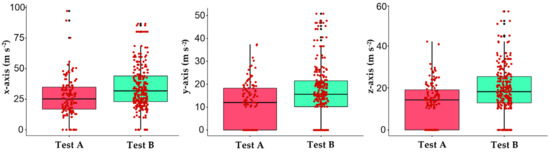 | Orthogonal Axis | Mean Acceleration (Test A) | Mean Acceleration (Test B) | Coefficient of Variation | Standard Deviation | p-Value |