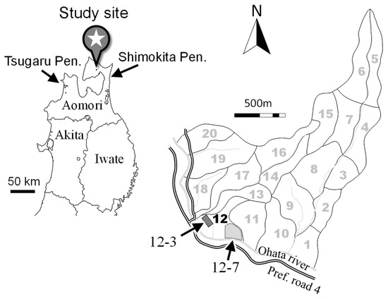 The experimental forest of Ōhata (41°23′ N, 141°03′ E) stretches from 65 to 404 m a.s.l. in the north of Shimokita peninsula, about 7 km west from Ōhata (Figure 1). The bedrocks are green tuff, pyroxene andesite, and volcanic mudflow; the soil types are 90% brown soil and 6% podzol [32]. According to the Japan Meteorological Agency [35], long-term values (1981–2010) of medium annual precipitation at Ōhata have been recorded as 1342 mm y−1, and the mean monthly air temperature during the warmest (August) and coldest (January) months is 21.7 and −1.4 °C. Snow cover lasted from November until April, with a maximum depth of 65 cm.