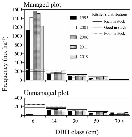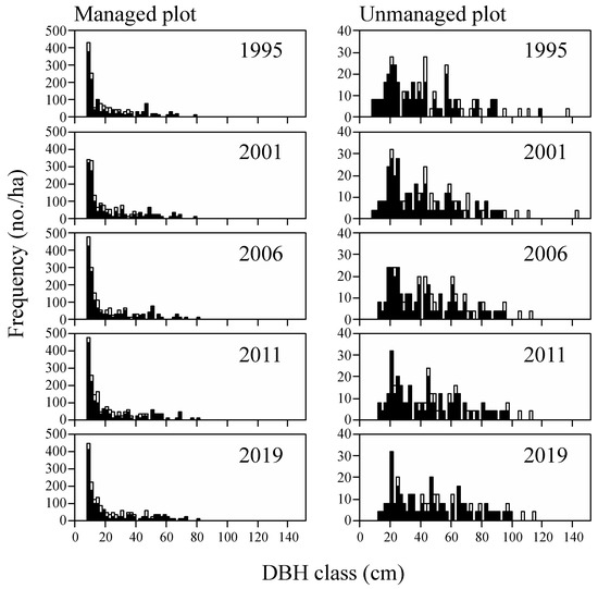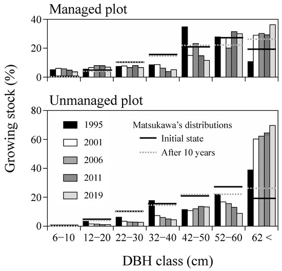 The distribution of the growing stock by DBH classes had clear overstockings with trees ≥42 cm in DBH; however, they varied since 1995 (Figure 6). We included the trees with 5 cm ≤ DBH for comparison with Matsukawa’s concept. The high share of the largest size class in 2019 indicates that over the years, trees grew considerably large diameters, contributing much to the high-growing stock. During the same period of observation, the growing stock in the unmanaged plot also increased from 883.6 to 981.7 m3 ha−1 (Table 3).