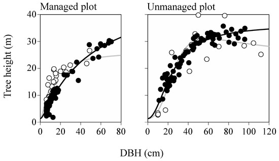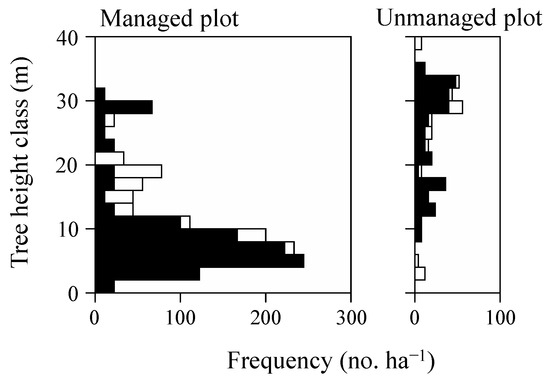 DBH (Figure 2) and, to some lesser extent since they are much steeper, tree height distribution (Figure 3) in the managed plot showed a clear reverse J-shaped distribution. However, the DBH curve in the unmanaged plot was unimodal with the highest values around 20 cm in DBH, as well as a flatter number of trees per DBH class and many large-diameter trees, compared to the managed plot. In the unmanaged plot, the distribution of tree height implies that there are very many hiba trees with a uniformly small height surviving in low stand layers and waiting for some sudden canopy opening to quickly stretch up into the gap (Figure 3). Such differences contrast with the uniformity of the tree height–stem diameter relationship in both managed and unmanaged stands for hiba trees. In both plots, hiba trees reached a height of approximately 30 m at a DBH of 60 cm, indicating that hiba trees surpass growth trajectories of tree height and stem diameter almost uniformly. However, the height growth of broadleaved trees in unmanaged plots is levelling off to 27 m at a DBH of 40 cm, whereas this occurs earlier (DBH = 25 cm) in the managed plots at a lower level (tree height = 20 m), which is a clear effect of selection-cutting silviculture favouring hiba and the removal of fast-growing broadleaves that would reach into the upper canopy layer.