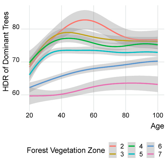Model (GAM) of HDR development by forest vegetation zones (FVZs 2–7). Shadow areas depict 95% confidence intervals of means.