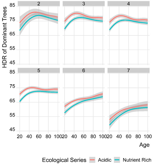 Model (GAM) of HDR development at two ecological series by forest vegetation zones (FVZs 2–7). Shadow areas depict 95% confidence intervals of means. Red and blue lines represent acid and nutrient-rich sites, respectively.