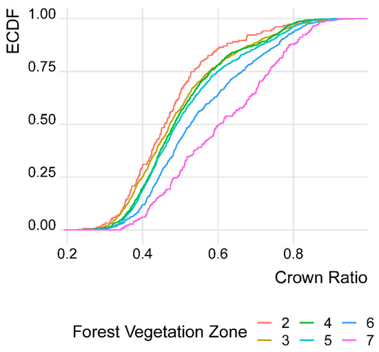 Empirical cumulative density curves (ECDF) of dominant trees’ HDR by forest vegetation zones (FVZs 2–7).