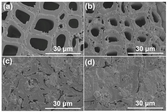 The microstructure of the cross-section of different wood samples: (a) natural wood, (b) DW, (c) MDW, and (d) CMDW.