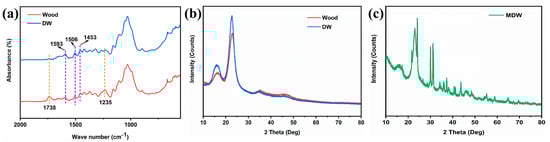 Chemical components of different wood samples: (a) FTIR spectra of wood and DW; (b) XRD spectra of wood and DW; (c) XRD spectrum of MDW.
