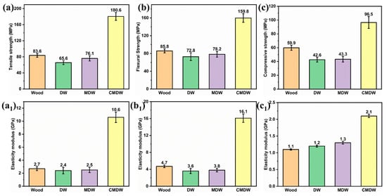 The tensile strength (a,a1), flexural strength (b,b1), compressive strength (c,c1), and corresponding elasticity moduli of wood, DW, MDW, and CMDW.