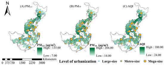 PM2.5 distribution showed obvious regional variation between cities with different urbanization levels (Figure 2). The aggregation of high values in PM2.5 was mainly found in the metro-size city of Changchun and the mega-size city of Harbin in Northeast China (Figure 2A). The aggregation of high values in PM10 was mainly found in the metro-size cities of Jinan and Tangshan in northern regions of China (Figure 2B). The aggregation of high values in AQI was mainly found in the metro-size city of Changchun and the mega-size city of Harbin in Northeast China (Figure 2C). Severe levels of air pollutants (concentrations over 75 μg/m3 for PM2.5, over 150 μg/m3 for PM10, and over 150 for AQI) were found to be more frequent in cities at Northeastern and Northern China.