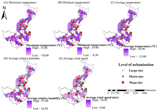 Meteorological factors also had obvious regional variations (Figure 3). Specifically, the high values of temperature were clustered in regions around the mega-size city of Chongqing and the metro-size city of Fuzhou in South China (Figure 3A–C). The high values of relative humidity were clustered in the mega-size cities of Suzhou and Shanghai in eastern regions (Figure 3D). High wind velocities were mainly clustered in regions around the large-size city of Dandong and the metro-size city of Dalian in northeastern regions (Figure 3E).