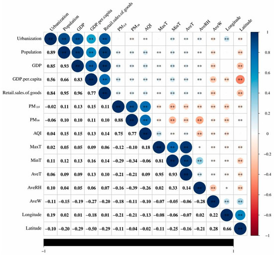 Longitude and latitude were positively correlated to each other. Among air pollutant variables, longitude had negative relationships with PM2.5 (r = −0.22, p < 0.01), PM10 (r = −0.20, p < 0.01), and AQI (r = −0.15, p < 0.01). Among meteorological parameters, longitude was negatively correlated with maximum temperature (r = −0.06, p < 0.01), minimum temperature (r = −0.10, p < 0.01), average temperature (r = −0.07, p < 0.01), and average relative humidity (r = −0.04, p < 0.01). Longitude also had a positive correlation with average wind velocity (r = 0.26, p < 0.01)). Among economic parameters, longitude had negative relationships with GDP (r = −0.12, p < 0.01), GDP per capita (r = −0.21, p < 0.01), total retail sales of social consumer goods (r = −0.05, p < 0.01), and population (r = −0.07, p < 0.01).