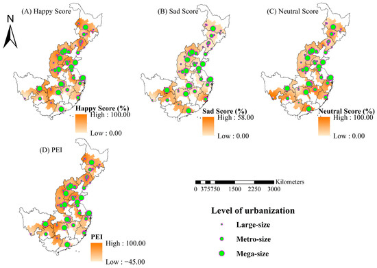 Spatial interpolation maps of happy score (A), sad score (B), neutral score (C), and PEI (D) based on different levels of urbanization.