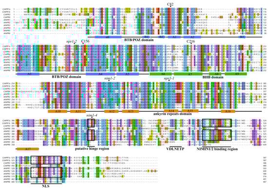 Multiple sequence alignments of NPR1-like proteins in Camellia sinensis and Arabidopsis thaliana. The critical mutation sites of npr1-1, npr1-2, nim1-2, and nim1-4, as well as the highly conserved cysteine residues (C82, C216, and C156) identified in AtNPR1, are indicated by black arrowheads. The conserved structural domains BTB/POZ, BHB, and ANK, the putative hinge region (LENRV), the EAR-like repressor motif (VDLNETP), the NIMIN binding region, and the nuclear localization signal (NLS) are indicated by black lines. The colored rectangles below the sequence represent the α-helix, including α0 and A1–A17, and the blue arrows represent the β-sheets of B1–B3.