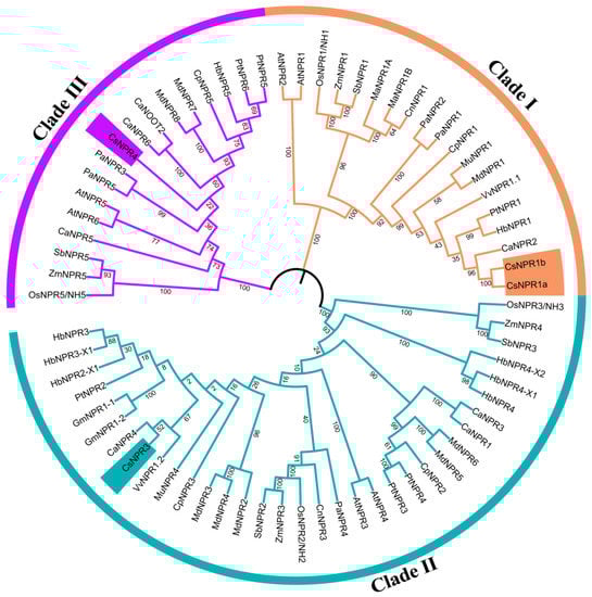 Phylogenetic tree construction is a crucial method for analyzing the functionality of the CsNPR1-like genes. In this study, based on the classification results of the phylogenetic tree, the 70 NPR1 protein sequences from various species were categorized into three clades. Among these, clade II exhibited the highest number of members with 34, clade I consisted of 19 members, and clade III contained 17 members (Figure 2). CsNPR1a and CsNPR1b were assigned to clade I, which also includes AtNPR1 and AtNPR2. It has been previously reported that AtNPR1 and AtNPR2 function as positive regulators of systemic acquired resistance (SAR). CsNPR3, AtNPR3, and AtNPR4 belong to clade II, where AtNPR3 and AtNPR4 act as negative regulators of SAR. Furthermore, the CsNPR4 protein is classified under clade III alongside AtNPR5 and AtNPR6, which are involved in organ determinism and symmetry.