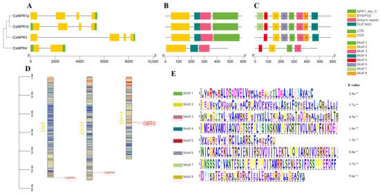 Neighbor-joining phylogenetic tree, gene structure, domain architecture, conserved motif, and chromosomal distribution analysis of the CsNPR1-like protein-coding genes and corresponding products in Camellia sinensis. (A) The gene structure of four CsNPR1-like genes. (B) Conserved structural domains in the BTB/POZ, ankyrin repeat, and NPR1-like-C regions of the CsNPR1-like proteins are similarly represented by differently colored boxes. (C) Conserved motif and (E) amino acid sequence of four CsNPR1-like proteins. (D) The chromosomal distributions of NPR1-like genes in Camellia sinensis.