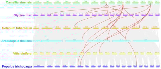 In the analysis of gene structure, CsNPR1a, CsNPR1b, and CsNPR3 consist of four exons and three introns, whereas CsNPR4 has two exons and one intron. Notably, CsNPR3 possesses a long intron, and CsNPR1a and CsNPR1b exhibit the same number of exons and similar intron positions, aligning with the expected evolutionary results (Figure 3A). Analysis of conserved structural domains reveals that all NPR1-like proteins contain an N-terminal BTB/POZ structural domain and a central ankyrin repeat domain (Figure 3B). Furthermore, genes in both the first and second branches of the evolutionary tree exhibit the NPR1-like C-terminal region, which is known to be a crucial component of the NPR1-like gene family and assumes a key role [27,31]. All CsNPR1-like proteins contain the DUF3420 structural domain, which is presumed to be present in eukaryotes and spans approximately 50 amino acids. However, its function has not yet been characterized. Moreover, eight conserved motifs were identified in four CsNPR1-like proteins (Figure 3C,E). They share motifs 1, 2, 3, and 5. Interestingly, while there were eight types of motifs among the four proteins, their motif compositions were not identical. For instance, CsNPR1a, CsNPR1b, and CsNPR3 possessed motifs 4, 6, and 8, whereas CsNPR1a and CsNPR1b had motif 7 exclusively. The presence of shared conserved motifs within the CsNPR1-like gene family supports the classification of these genes as a multigene family. To explore the synteny relationship between the NPR1-like gene in Camellia sinensis and other species, six species, including Camellia sinensis, Glycine max, Solanum tuberosum, Arabidopsis thaliana, Vitis vinifera, and Populus trichocarpa, were analyzed for collinearity (Figure 4, Table S9). The analysis revealed that the number of CsNPR1-like collinear genes in tea plants and the other five species was comparable, ranging from two to four pairs. This finding suggests a high degree of conservation of the NPR1-like gene among different species.