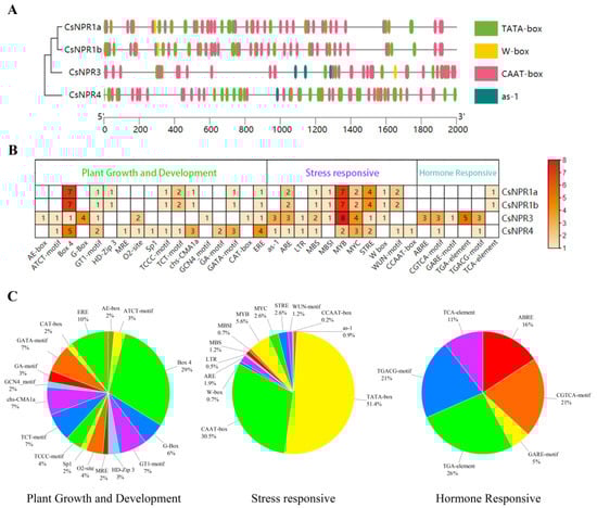 Cis-regulatory element analysis of CsNPR1-like genes. (A) The promoter region of the CsNPR1-like gene (2000 bp upstream of the ATG translation initiation codon) was used to analyze four specific SA response elements. These include the TATA-box, the W-box, the CAAT-box, and the as-1 element, which are indicated by separate colored boxes. (B) Statistics on the number of cis-acting elements in the CsNPR1-like gene family. The different numbers and colors of the grid show the number of different classes of promoter elements in these genes. (C) The proportion of all cis-acting elements in the CsNPR1-like genes that are involved in the three classifications.