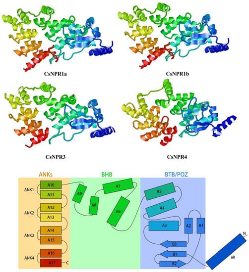 The composition and structure of proteins play a decisive role in their properties and biological functions. A protein’s secondary and tertiary structures provide a powerful clue to exploring its function. By predicting the secondary and tertiary structures of four CsNPR1-like protein sequences, it was found that the protein structure of this family member is mainly composed of a α-helix and an irregular curl, but there are also a few β-sheets and extended chains. The results showed that the range of α-helix, extension chain, β-sheet, and irregular curl was 45.42%–54.86%, 6.31%–8.75%, 4.10%–5.62%, and 33.39%–40.21%, respectively (Table S2). By comparing the tertiary structures of four CsNPR1-like genes, it can be found that the structures of the four model maps are very similar (Figure 6). The α-helix and β-sheet are exhibited below as cartoon models, with all four models containing a BTB/POZ structure consisting of five α-helixes and three β-sheets. At the C-terminus of the BTB domain, a unique four-helix bundle is contained that shares a helix pair repeating pattern with the BTB and carboxyterminal Kelch (BACK) domains [70,71], but is much shorter than BACK (four helix pairs), hence the name BACK Helix Bundle (BHB). The BHB is followed by an extended linker loop that connects the BHB to the ankyrin repeats (ANKs). NPR1 contains three well-defined ANKs as well as a non-canonical fourth ANK with two α helixes linked by a 16-residue loop [72,73,74]. The last three ANKs are connected by feature β hairpins, while the first two ANKs are connected by loops. These structures are highly conserved among CsNPR1-like members [75].