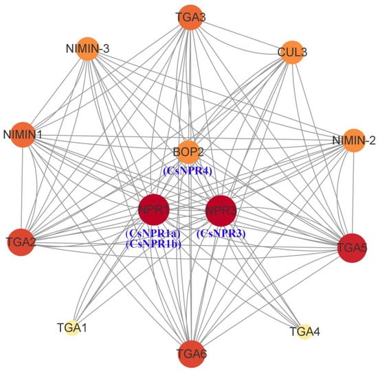 PPI analysis of CsNPR1-like proteins. The middle three nodes represent the CsNPR1-like proteins, and the outer ten nodes are predicted proteins that interact with CsNPR1-like proteins. TGA1, TGA2, TGA3, TGA4, TGA5, and TGA6 belong to the TGACG motif-binding factors. NIMIN represents the protein NIM1-INTERACTING, and CUL3 represents the cullin-RING ubiquitin ligases (CRL).