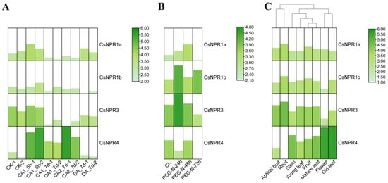 Expression pattern for CsNPR1-like genes in tea plants under different tissue/organ and abiotic stresses. (A) The heatmap represents the relative expression levels of the four CsNPR1-like genes under cold stress. The five stages represent non-acclimated at 25~20 °C (CK-1, CK-2), fully acclimated at 10 °C for 6 h (CA1_6h-1, CA1_6h-2) and 10~4 °C for 7 days (CA1_7d-1, CA1_7d-2), cold response at 4~0 °C for 7 days (CA2_7d-1, CA2_7d-2) and recovering under 25~20 °C for 7 days (DA_7d-1, DA_7d-2). (B) The expression patterns of CsNPR1-like genes in response to 25% PEG treatment for 0, 24, 48, and 72 h. (C) Expression analysis of CsNPR1-like genes in different tissues. The scale bar on the right represents the log2 conversion value of fragments per kilobase million (FPKM) per gene.