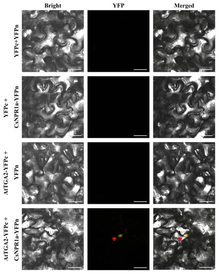 The full-length coding sequences of AtTGA2 and CsNPR1a were cloned by GATEWAYTM LR ClonaseTM enzyme Mix into the vectors pCL112 and pCL113 containing the attR site, respectively, to obtain recombinant plasmids CsNPR1a-YFPn and AtTGA2-YFPc. The combination of CsNPR1a-YFPn and AtTGA2-YFPc was co-transfected into N. benthamiana leaves and observed under laser confocal microscopy.