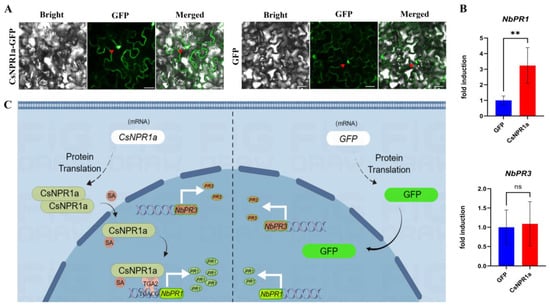 Transient expression of CsNPR1a activates NbPR1 expression in N. benthamiana leaves. (A) Subcellular location of the CsNPR1a-GFP fusion protein in N. benthamiana epidermal cells. The red triangles indicate nuclei. Bar = 30 µm. (B) The expression levels of NbPR1 and NbPR3 in N. benthamiana leaves infiltrated with agrobacterium carrying free-GFP or CsNPR1a-GFP-expressing constructs. NbACT was used as the reference gene, and the level of expression in free-GFP agroinfiltrated leaves was set to 1. The mean and standard deviation were obtained from three replicates. A marked “**” between the two histograms indicates a significant difference, and “ns” indicates no significant difference (p < 0.05). (C) A model illustrates that CsNPR1a and free GFP were transiently expressed in the cytoplasm, and salicylic acid-activated monomeric CsNPR1a translocated to the nucleus, where it interacted with TGA transcription factors to specifically activate the expression of NbPR1 but not NbPR3, whereas GFP had no effect on both genes.