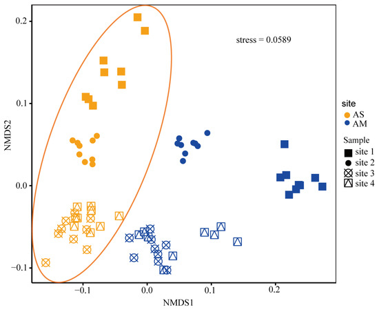 Nonmetric multidimensional scaling (NMDS) based on Bray–Curtis dissimilarity displaying samples in the alpine steppes and meadows. Different shapes show different soil sampling points, orange and blue represent alpine steppes and alpine meadows, respectively. AS and AM represent alpine steppes and alpine meadows in all figures. Site 1, site 2, site 3, and site 4 represent sampling sites situated in Datong, Gonghe, Maqin, and Maduo, respectively.