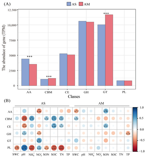 The abundance of CAZyme genes at class level in the alpine steppes and meadows (A). AAs: Auxiliary activities, CBMs: Carbohydrate-binding module, CEs: Carbohydrate esterase, GHs: Glycoside hydrolase, GTs: Glycosyl transferase, PLs: Polysaccharidelyase, CEs: Carbohydrate esterase. Significant p values as tested by Mann–Wilcoxon test are indicated (*, p < 0.05; **, p < 0.01; ***, p < 0.001). Relationships between the abundance of CAZyme families and environmental factors based on Spearman (significance: *, p < 0.05; **, p < 0.01; ***, p < 0.001) (B).