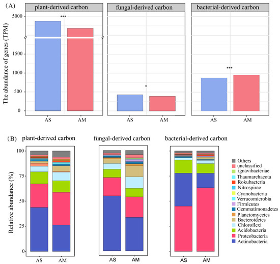 The abundance of genes encoding enzymes degrading plant-, fungal-, and bacterial-derived carbon between alpine steppes and meadows (A). Significant p values as tested by the Mann–Wilcoxon test are indicated (*, p < 0.05; ***, p < 0.001). Changes of microbial composition with decomposing plant-, fungal-, and bacterial-derived carbon in the alpine steppes and meadows (B). Microbial composition shown at the phylum level; the abundance of each taxon (accounted for the top eleven) was calculated as the percentage of microbial group. Different colors represent different phylum.