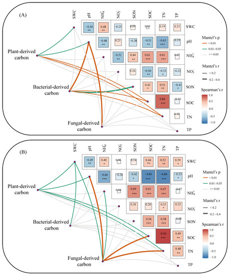 In the alpine steppes, Mantel test analysis showed that SWC, pH, SOC, and TN (Mantel’s r < 0.2, Mantel’s p < 0.05) were significantly related to the microorganism degradation of plant-derived carbon. In addition, pH, SON, SOC, and TN (Mantel’s r > 0.2, Mantel’s p < 0.05) had a stronger correlation with the microorganism degradation of bacterial-derived carbon (Figure 4A). Soil pH was an important factor influencing plant-derived carbon decomposition and had a strong correlation with microorganism degradation of fungal-derived carbon decomposition (Mantel’s r > 0.2, Mantel’s p < 0.01). In the alpine meadows, SWC, pH, SOC, and TN (Mantel’s r < 0.2, Mantel’s p < 0.05) were strongly correlated with the microbial degradation of plant-derived carbon. Only SWC (Mantel’s r < 0.2, Mantel’s p < 0.05) was significantly related to microbial degradation during bacterial-derived carbon decomposition. SWC, pH, NH4+, SOC, and TN (Mantel’s r < 0.2, Mantel’s p < 0.05) were correlated with the microbial degradation of fungal-derived carbon (Figure 4B).