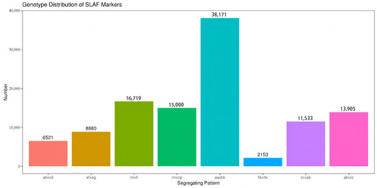 A total of 120 million reads were generated through SLAF-seq. The sequencing data quality was evaluated using the average Q30 ratio, which was found to be 93.78% in this investigation, indicating a high level of sequencing accuracy. Additionally, the average guanine cytosine (GC) content, which is a measure of the DNA composition, was found to be 37.75% (Table 1). After the removal of low-quality reads, a total of 532,450 SLAFs were obtained from the sequencing data. Among the 532,450 SLAF markers, 254,899 (47.87%) were identified as polymorphic. The average sequence depths for the parents and the progeny were 39.89 and 10.72, respectively. After excluding SLAF markers that lacked parent information and those containing repeat sequences, a total of 112,882 markers were successfully genotyped. These markers were then classified into eight segregation types: ab × cd (6521), ef × eg (8880), Im × II (16,719), nn × np (15,000), aa × bb (38,171), hk × hk (2153), cc × ab (11,533), and ab × cc (13,905) (Figure 1). Low-quality SLAF markers, markers displaying segregation distortion, and markers unsuitable for map construction were excluded. As a result, 4264 polymorphic markers remained, which were classified into four segregation types: ef × eg (52), hk × hk (153), lm × ll (2165), and nn × np (1894). These markers were considered suitable for subsequent map construction and further analysis.